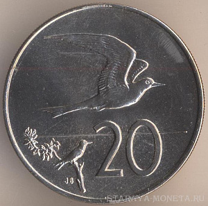 20 тене (центов) 1973 года, медно-никелевый сплав, масса - 11,31 грамма, диаметр - 28,52 мм, тираж - 49000 экземпляров. Гравёры: Арнольд Мэйчин (аверс - портрет королевы Елизаветы II ) и Джордж Джеймс Берри (реверс). Чеканились в 1972-75 и 1983 годах.