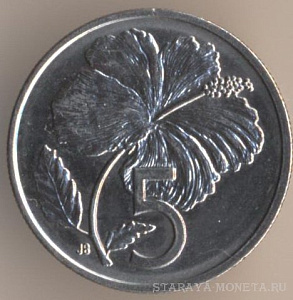 5 тене (центов) 1992 года, медно-никелевый сплав, масса - 2,83 грамма, диаметр - 19,41 мм, тираж неизвестен. Гравёры: Рафаэль Дэвид Маклауф (аверс - портрет королевы Елизаветы II ) и Джордж Джеймс Берри (реверс). Чеканились в 1987-78, 1992 и 1994 годах.