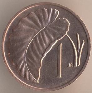 1 тене (цент) 1973 года, бронза, масса - 2,07 грамма, диаметр - 17,53 мм, толщина - 0,9 мм, тираж - 8500 экземпляров. Гравёр: Арнольд Мэйчин (аверс - портрет королевы Елизаветы II) и Джордж Джеймс Берри (реверс). Чеканились в 1972-77, 1979 и 1983 годах.