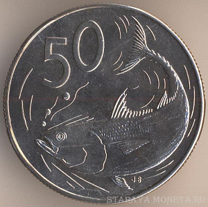 50 тене (центов) 1973 года, медно-никелевый сплав, масса - 13,8 грамма, диаметр - 31,75 мм, тираж - 19000 экземпляров. Гравёры: Арнольд Мэйчин (аверс - портрет королевы Елизаветы II ) и Джордж Джеймс Берри (реверс). Чеканились в 1972-78, 1981 и 1983 годах.