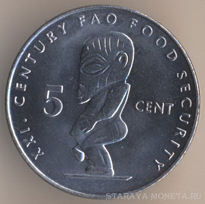 5 тене (центов) 2000 года, плакированная никелем сталь, масса - 4,43 грамма, диаметр - 24,405, толщина - 1,2 мм, тираж неизвестен. Гравёры: Иэн Рэнк-Бродли (аверс - портрет королевы Елизаветы II ) и Джордж Джеймс Берри (реверс). "ФАО". Единственный выпуск.