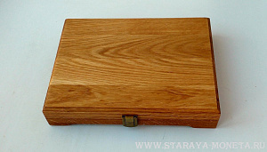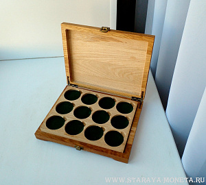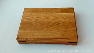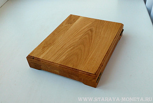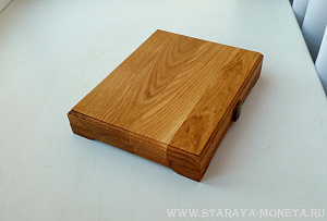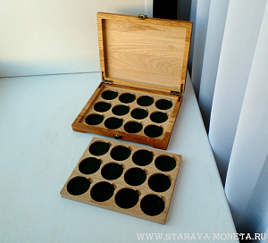 Бокс, натуральный дуб, для хранения и патинирования монет, медалей. На 24 ячейки диаметром 44 мм., предложите.