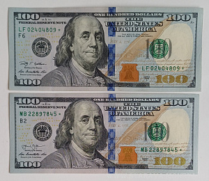 Здравствуйте. Предложите за 2 купюры по 100 долларов США со ☆.Состояние на фото, дополнительные фото по запросу.