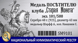 Основные параметры медали: серебро 925 пробы, вес 48 г., диаметр 43 мм. (вес и диаметр соответствуют параметрам медали Великого князя Георгия Михайловича). Общий тираж серебряной медали 500 шт., включая пробные и рабочие экземпляры, в процессе подготовки также производились оттиски штемпелей в разных металлах. Этими же штемпелями было отчеканено 10 медалей в золоте, вес 85,6 г., 916 пробы. Легенды на медали: ПОСѢТИТЕЛЮ КЛУБА / СТАРАЯ МОНЕТА, шрифт текста «ПОСѢТИТЕЛЮ КЛУБА» соответствует оригинальному шрифту на медали Георгия Михайловича, шрифт текста «СТАРАЯ МОНЕТА» соответствует оригинальному шрифту заголовка нумизматического журнала «Старая монета» 1910 г. Буквы СМ ННР в нижней части медали обозначают партнеров по совместному проекту выпуска.