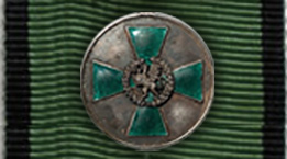 Третья степень знака – круглая серебряная матовая медаль с ободком по краю, на лицевой стороне которой расположен выпуклый, не доходящий до ободка серебряный покрытый зеленой эмалью крест, подобный второй степени, но меньшего размера, на оборотной стороне те же надписи. Носились эти знаки на груди левее российских орденов, но правее медалей на ленте темно-зеленого цвета с узкой черной полосой по краю.